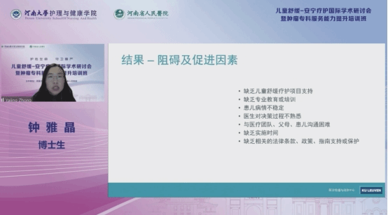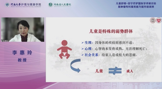 資深兒童安寧療護教育講師Amy Haskamp教授作《兒童舒緩療護模式簡介》報告,她從兒童健康照護的發(fā)展歷史講到重癥患兒照護的倫理問題,提出舒緩療護和臨終關(guān)懷的區(qū)別與聯(lián)系和如今兒童舒緩療護的理念和目標,她還分享《兒童舒緩療護相關(guān)倫理及法律問題》《兒童舒緩療護中的癥狀管理》《親人離世后的哀痛輔導(dǎo)》等專題內(nèi)容;波士頓學(xué)院康乃爾護理學(xué)院臨床教授Vanessa Battista作《圍產(chǎn)期及新生兒的舒緩療護》《兒童疼痛管理》《溝通》《患兒離世前期的照護》等四篇報告;北京大學(xué)護理學(xué)院孫宏玉教授作《護理學(xué)專業(yè)人才培養(yǎng)中人文關(guān)懷的重要性》報告,提出要重視護理專業(yè)人文關(guān)懷能力的培養(yǎng);中南大學(xué)湘雅護理學(xué)院院長唐四元教授以《兒童居家安寧療護發(fā)展》為題,介紹兒童居家安寧療護的定義和優(yōu)勢,為兒童安寧療護更好地發(fā)展指明方向;天津醫(yī)科大學(xué)護理學(xué)院黨委書記趙岳教授在《孤獨癥譜系障礙兒童的健康管理》報告中講述我國孤獨癥兒童的服務(wù)情況和孤獨癥的病因與臨床表現(xiàn),提出治療原則與方法;大連大學(xué)護理學(xué)院院長安力彬教授以《兒童護理人文關(guān)懷》為主題介紹兒童護理的重要性,講述兒童護理與人文關(guān)懷的技巧;蘇州大學(xué)醫(yī)學(xué)院護理學(xué)院院長李惠玲教授在《兒童舒緩與安寧療護敘事》中闡述兒童安寧療護的核心和具體方法;首都醫(yī)科大學(xué)副教授岳鵬以《兒童緩和醫(yī)療中的家庭會議》為題,闡述兒童緩和醫(yī)療中的家庭會議的未來發(fā)展方向;美國伯明翰大學(xué)護理與助產(chǎn)學(xué)院副教授郭平作《舒緩醫(yī)療在全球范圍內(nèi)的發(fā)展及應(yīng)用》的演講,講述舒緩醫(yī)療在全球的的發(fā)展與應(yīng)用;鄭州第九人民醫(yī)院副院長李玲作《安寧療護中的兒童服務(wù)實踐》報告,深入講解了人為關(guān)懷在兒童姑息治療與安寧療護的治療建議;首都醫(yī)科大學(xué)副教授周翾的《介紹國內(nèi)兒童舒緩療護的發(fā)展及現(xiàn)況》分析國內(nèi)兒童舒緩療護的現(xiàn)狀、資源分布和未來展望;馬偕兒童醫(yī)院醫(yī)師勞萱之作《亞洲地區(qū)重癥患兒疼痛及癥狀處理》的報告,介紹了亞洲地區(qū)重癥患兒疼痛及癥狀處理的方法;南京醫(yī)科大學(xué)方擁軍教授通過《公立醫(yī)院兒童安寧療護的實踐與思考》為護理人員介紹豐富的兒童安寧療護的方法與技巧;博士生鐘雅晶以《Physicians'attitudes and experiences towards withholding/withdrawing life-sustaining treatments in pediatric patients:a systematic review of quantitative evidence》為題,講述兒童治療中大多數(shù)醫(yī)生愿意和父母及兒童一同做決定,為解決兒童相關(guān)臨床醫(yī)療問題提供借鑒。