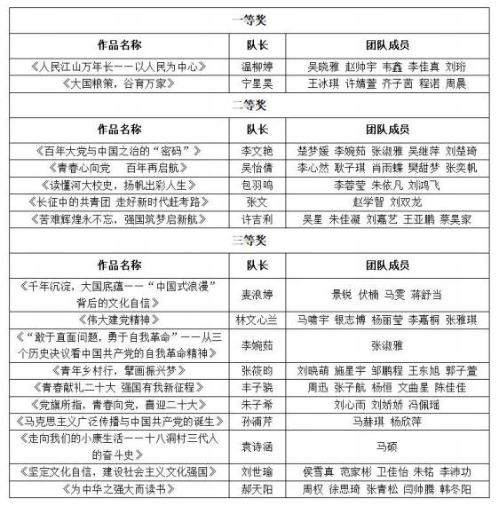 為深入貫徹落實(shí)習(xí)近平總書(shū)記關(guān)于“大思政課”的重要指示批示精神,堅(jiān)持不懈用習(xí)近平新時(shí)代中國(guó)特色社會(huì)主義思想鑄魂育人,引導(dǎo)學(xué)生深刻認(rèn)識(shí)“兩個(gè)確立”的決定性意義,增強(qiáng)“四個(gè)意識(shí)”,堅(jiān)定“四個(gè)自信”,不斷增強(qiáng)他們對(duì)思政課的獲得感,以實(shí)際行動(dòng)迎接黨的二十大勝利召開(kāi),我校于2022年6月啟動(dòng)習(xí)近平新時(shí)代中國(guó)特色社會(huì)主義思想大學(xué)習(xí)領(lǐng)航計(jì)劃主題教育活動(dòng)。活動(dòng)開(kāi)展期間,我校學(xué)生廣泛參與,經(jīng)個(gè)人申報(bào)、主辦單位組織專家評(píng)審,現(xiàn)將獲獎(jiǎng)名單予以公布。