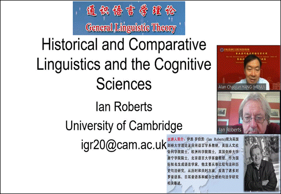 Ian Roberts現(xiàn)為英國(guó)劍橋大學(xué)理論及應(yīng)用語(yǔ)言學(xué)系教授,英國(guó)人文社會(huì)科學(xué)院院士,歐洲科學(xué)院院士,英國(guó)劍橋大學(xué)唐寧學(xué)院院士,北京語(yǔ)言大學(xué)客座教授。作為國(guó)際知名生成語(yǔ)法學(xué)家,他主要從事比較句法和歷史句法研究,從歷時(shí)和共時(shí)方面,發(fā)表了諸多對(duì)羅曼語(yǔ)系、日耳曼語(yǔ)系和威爾士語(yǔ)的句法學(xué)研究相關(guān)著述。本場(chǎng)第一講的題目是“現(xiàn)代歷史和比較語(yǔ)言學(xué)及認(rèn)知科學(xué)(Modern Historical and Comparative Linguistics and Cognitive Science)”。在本講中,Ian Roberts教授首先指出歷史和比較語(yǔ)言學(xué)絕對(duì)是認(rèn)知科學(xué)的核心。隨后,Ian Roberts教授討論了現(xiàn)代認(rèn)知科學(xué)、傳統(tǒng)和現(xiàn)代歷史語(yǔ)言學(xué)、比較語(yǔ)言學(xué),并引入了對(duì)語(yǔ)言學(xué)歷史的反思,最終得出結(jié)論,不僅當(dāng)代生成語(yǔ)言學(xué)沒有“黯然失色”(正如Boden 2007在她的認(rèn)知科學(xué)史中所建議的那樣),它實(shí)際上是提供了一種新的思想綜合,將語(yǔ)言學(xué)中兩個(gè)古老的傳統(tǒng)結(jié)合在一起。