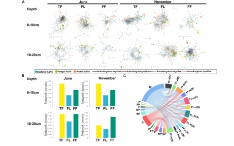圖1. 三種土地利用方式下的微生物網(wǎng)絡(luò)系統(tǒng)