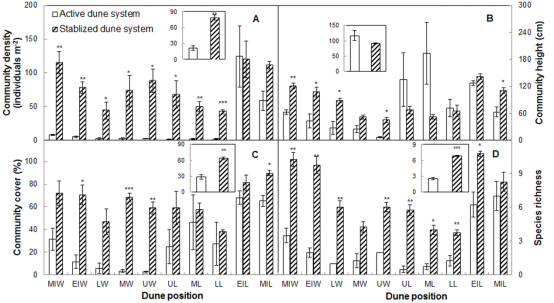 圖3.長(zhǎng)期禁牧對(duì)不同沙丘系統(tǒng)位置植物群落密度、高度、蓋度和物種豐富度的影響