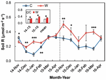圖2.非生長(zhǎng)季增溫處理對(duì)月平均動(dòng)態(tài)土壤呼吸(插圖為年平均值)的影響