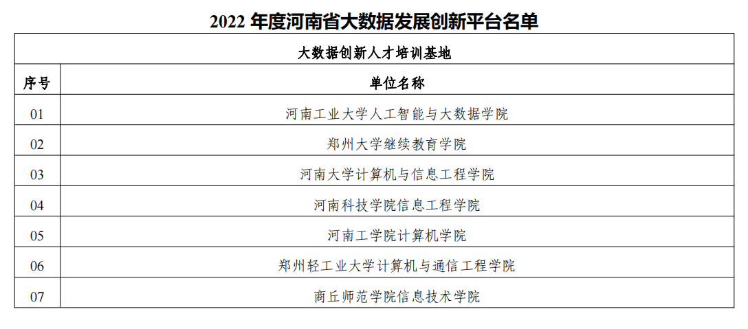 近日,河南省工業(yè)和信息化廳公布了2022年度河南省大數(shù)據(jù)發(fā)展創(chuàng)新平臺名單(豫工信數(shù)據(jù)〔2022〕102號)。計算機與信息工程學(xué)院獲批河南省大數(shù)據(jù)創(chuàng)新人才培訓(xùn)基地。