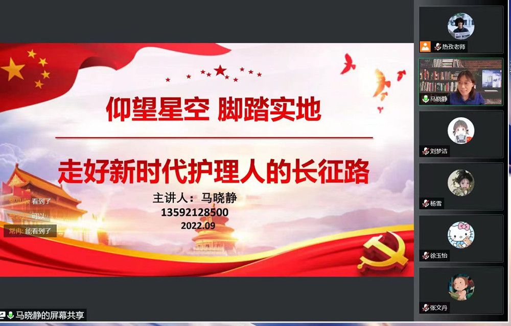 9月4日上午,為引導(dǎo)2022級(jí)本科新生正確認(rèn)識(shí)“小我”和“大我”,激勵(lì)同學(xué)們將榮校、愛國、報(bào)國作為奮斗目標(biāo),護(hù)理與健康學(xué)院黨委書記馬曉靜為2022級(jí)新生作題為《仰望星空腳踏實(shí)地——走好新時(shí)代護(hù)理人的長征路》的講座,全體2022級(jí)本科新生線上參會(huì),會(huì)議由2022級(jí)本科輔導(dǎo)員熱孜萬古麗·黑木都老師主持。
