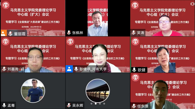 9月1日上午,馬克思主義學(xué)院在線上召開黨委理論學(xué)習(xí)中心組擴(kuò)大會(huì)議,專題學(xué)習(xí)教育部等十部門印發(fā)的《全面推進(jìn)“大思政課”建設(shè)的工作方案》(以下簡(jiǎn)稱“工作方案”),學(xué)院全體黨委委員、領(lǐng)導(dǎo)班子成員,各系、室主任,全體行政人員參加會(huì)議,會(huì)議由學(xué)院黨委書記彭緒琴主持。